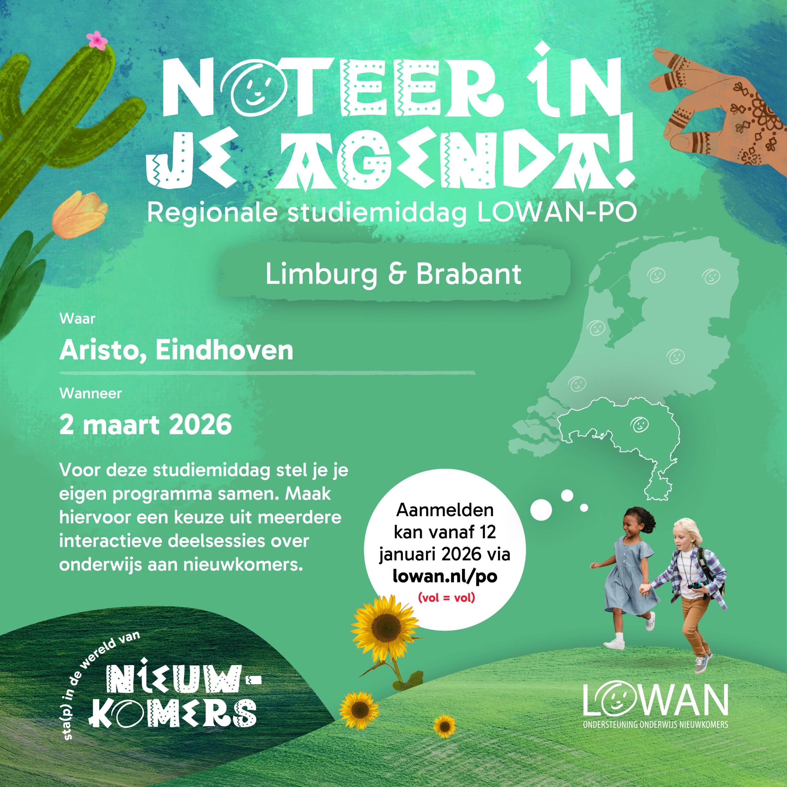 We organiseren dit jaar 6 studiemiddagen op verschillende plekken in het land. Een van deze studiemiddagen is op 2 maart in Eindhoven. Deze middagen zijn gericht op de doorstroom en ondersteuning van nieuwkomers in het regulier basisonderwijs. Met een lange termijn visie en een stevige doorgaande lijn versterken we het onderwijs aan deze doelgroep. Om zoveel mogelijk mensen de kans te geven deze studiemiddag bij te wonen, ontvangen we max 2 personen per school.