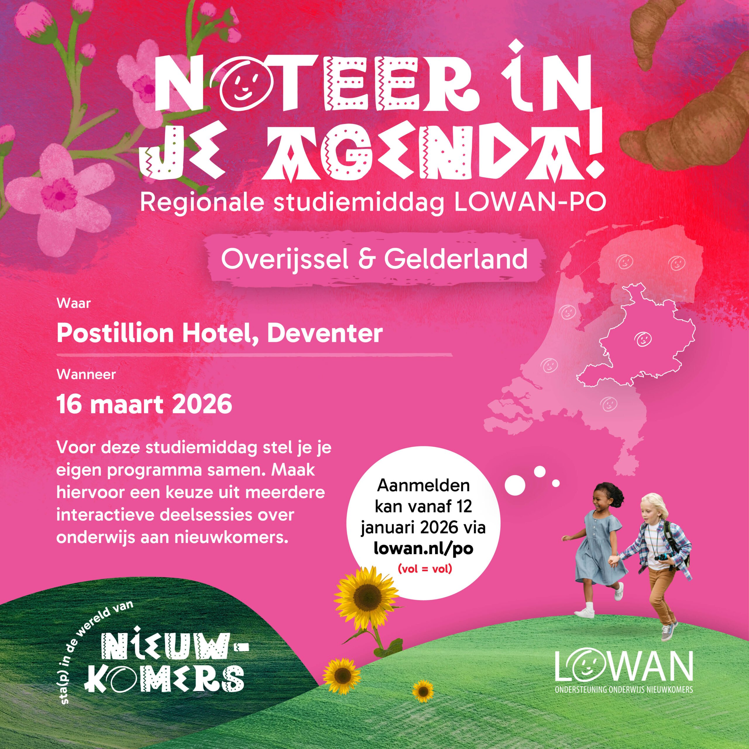 We organiseren dit jaar 6 studiemiddagen op verschillende plekken in het land. Een van deze studiemiddagen is op 16 maart in Deventer. Deze middagen zijn gericht op de doorstroom en ondersteuning van nieuwkomers in het regulier basisonderwijs. Met een lange termijn visie en een stevige doorgaande lijn versterken we het onderwijs aan deze doelgroep. Om zoveel mogelijk mensen de kans te geven deze studiemiddag bij te wonen, ontvangen we max 2 personen per school.