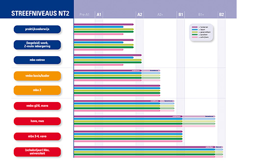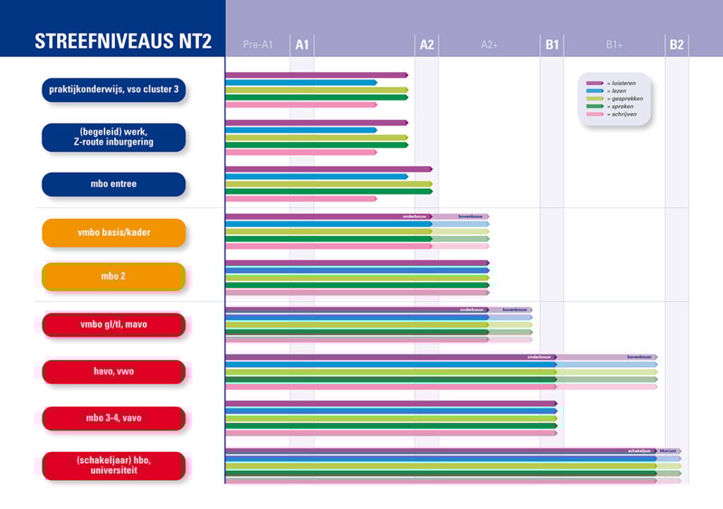 - De NT2-streefniveaus zijn op een aantal plekken bijgesteld: bij de vo-uitstroomprofielen maken we onderscheid tussen instroom in de onderbouw en instroom in de bovenbouw. En de streefniveaus voor mbo 3/4 en voor hbo en universiteit sluiten aan bij het Staatsexamen NT2 Programma I of II.